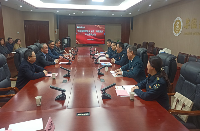 徐朝阳就第一附属医院发展情况进行介绍,并期望与海军军医大学第二附属医院建立深层次的合作关系,通过人才培养、教学实践、毕业生就业等方面的交流协作,实现资源共享、互利共赢。